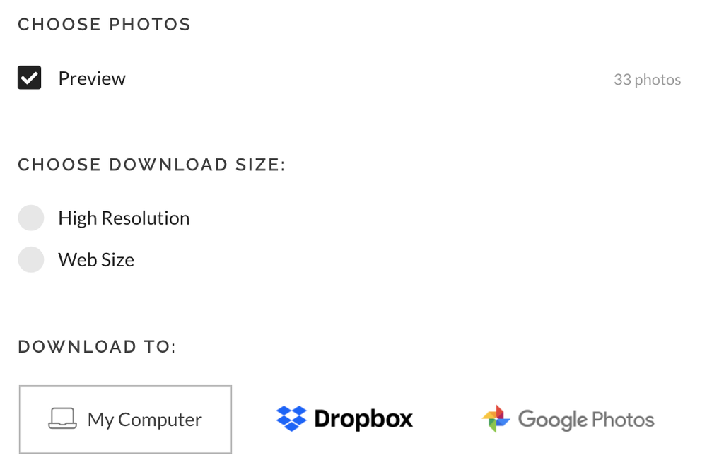Download the entire gallery, not just your favorites, to your computer. Make sure to select “high resolution” to save the highest quality images. You can also save a second set of images at “web size,” which is perfect for posting on facebook/instagram without compression (when your social app compresses your photo to make it a smaller file, it can get pixelated/overly grainy which can sometimes look pretty terrible).